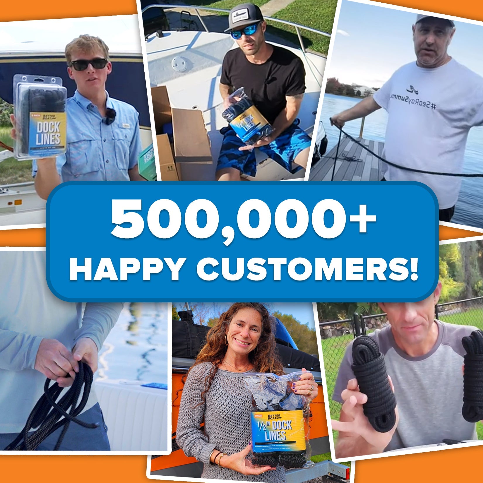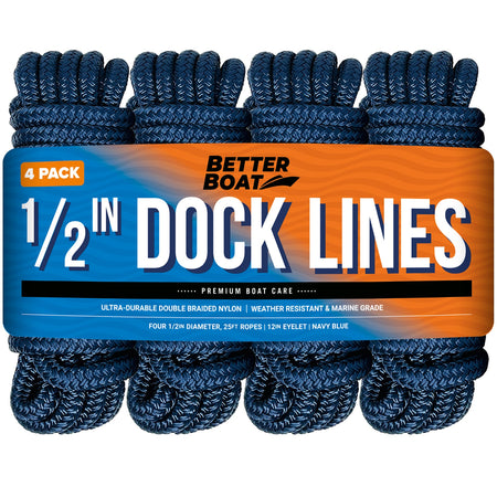Marine-grade double-braided nylon dock lines that are ultra-strong and durable. The working load for our 1/2 inch dock lines is 950 lbs., and the breaking strength is 4,939 lbs. Our 1/2 inch dock lines are 25 feet long with a 12 inch professionally whipped and heat-treated eyelet at one end. This premium-grade marine nylon rope provides superior shock absorption and elasticity to secure boats in high waves and rough weather. Sun, salt and water-resistant to last for seasons. Try them risk-free for 30 days - love them or get your money back!