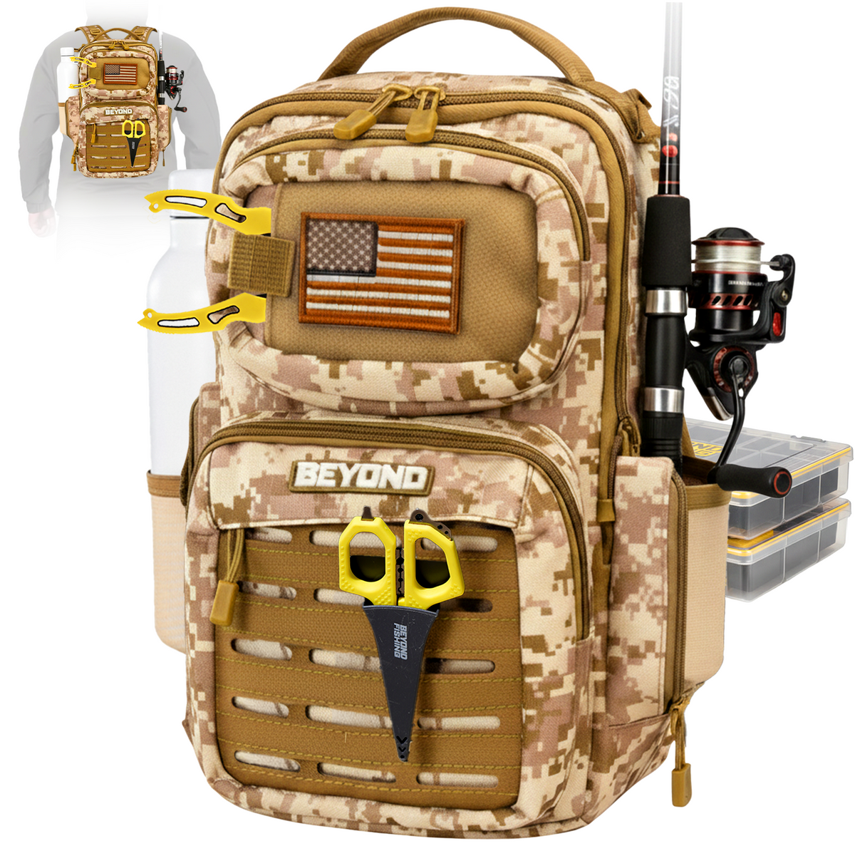 ALL-IN-ONE STORAGE- The main storage compartment fits 2 x 3600 sized tackle boxes, the top pouch fits your phone and keys perfectly with no room to spare, features a rod holder, bottle holder, pliers holder, a medium size pocket for leader spools, and smaller front pocket for whatever else you need! It carry it ALL!