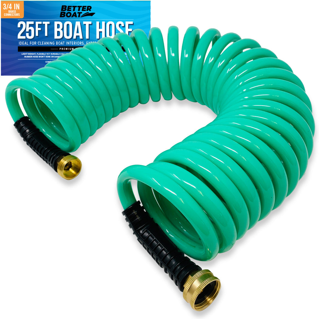 The self-coiling, space-saving design of our boat coil hose coils up perfectly every time for neat and easy storage. Made from ultra-durable yet flexible rubber that will never kink, fold or get tangled. Ideal for boats or anywhere space is tight. Features corrosion resistant brass fittings that are compatible with outdoor water faucets and a watertight washer for a no-leak seal. Comes in two lengths: 15 feet or 25 feet coil water hose. Try it risk-free for 30 days - love it or get your money back!