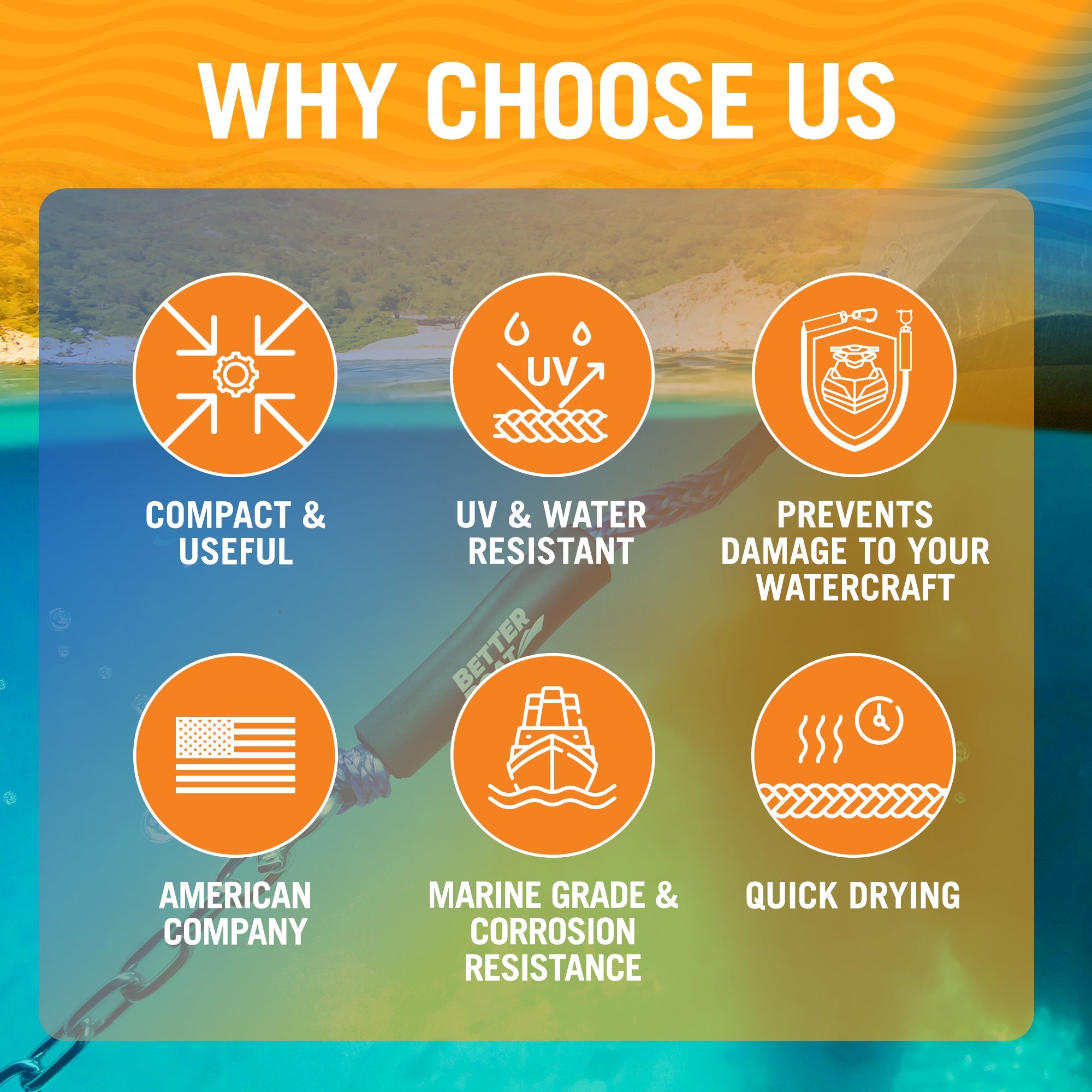 - ROBUST, QUICK-DRYING MATERIALS: Built to last through extreme conditions, our marine-grade accessories feature double braided, UV-resistant anchor lines suited for up to 4800 pounds with a tensile strength of 2640 pounds.