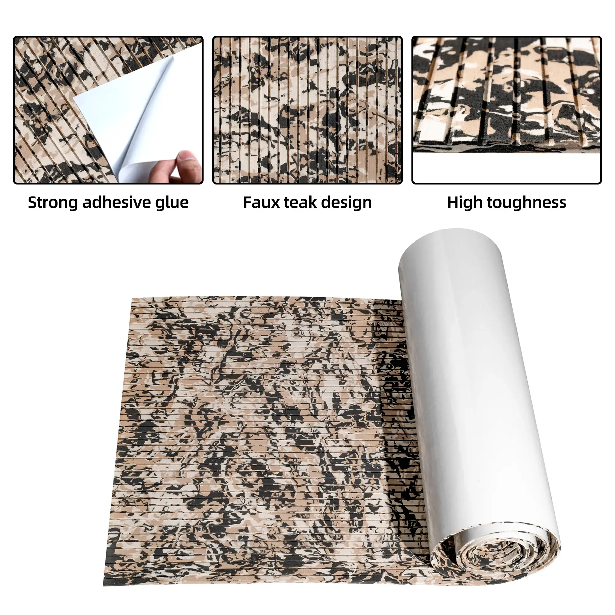 - High Quality EVA Foam - BoatFloorings Boat flooring uses high-quality EVA(Ethylene-vinyl Acetate) material. High durable eva foam boat decking; Not easy deformation; Not easy to tear or damage; Not easy to fade; High density. Maintain a constant temperature, not easy to absorb heat; Odorless, non-toxic, Non-Slip marine mat; Self-Adhesive boat carpet. Hardness: 55 (±1P)