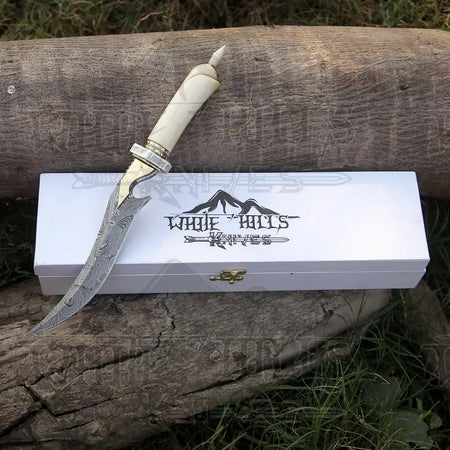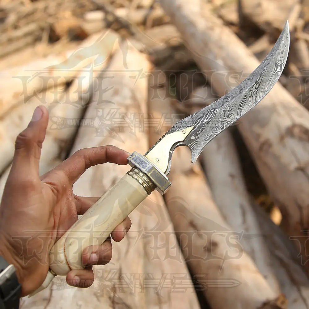 - Handle Material : High Polished Brass Wire Inlay Hand Carved Camel Bone Roundscale with Hand File Worked Brass Spacers, Damascus Guard & Camel Bone Pommel