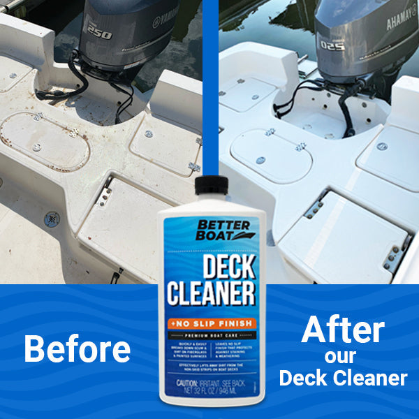 Our Better Boat deck and floor cleaner formula quickly and easily removes tough dirt, grease and grime. Restores white decks to their original bright white. Formulated to leave a non-skid polymer coating that makes walking around your boat easier and safer. This non-skid deck cleaner also repels build-up formation to keep your deck cleaner, longer. Safely cleans painted and fiberglass decks. Try this boat floor cleaner risk-free for 30 days - love it or get your money back!