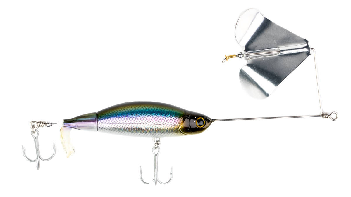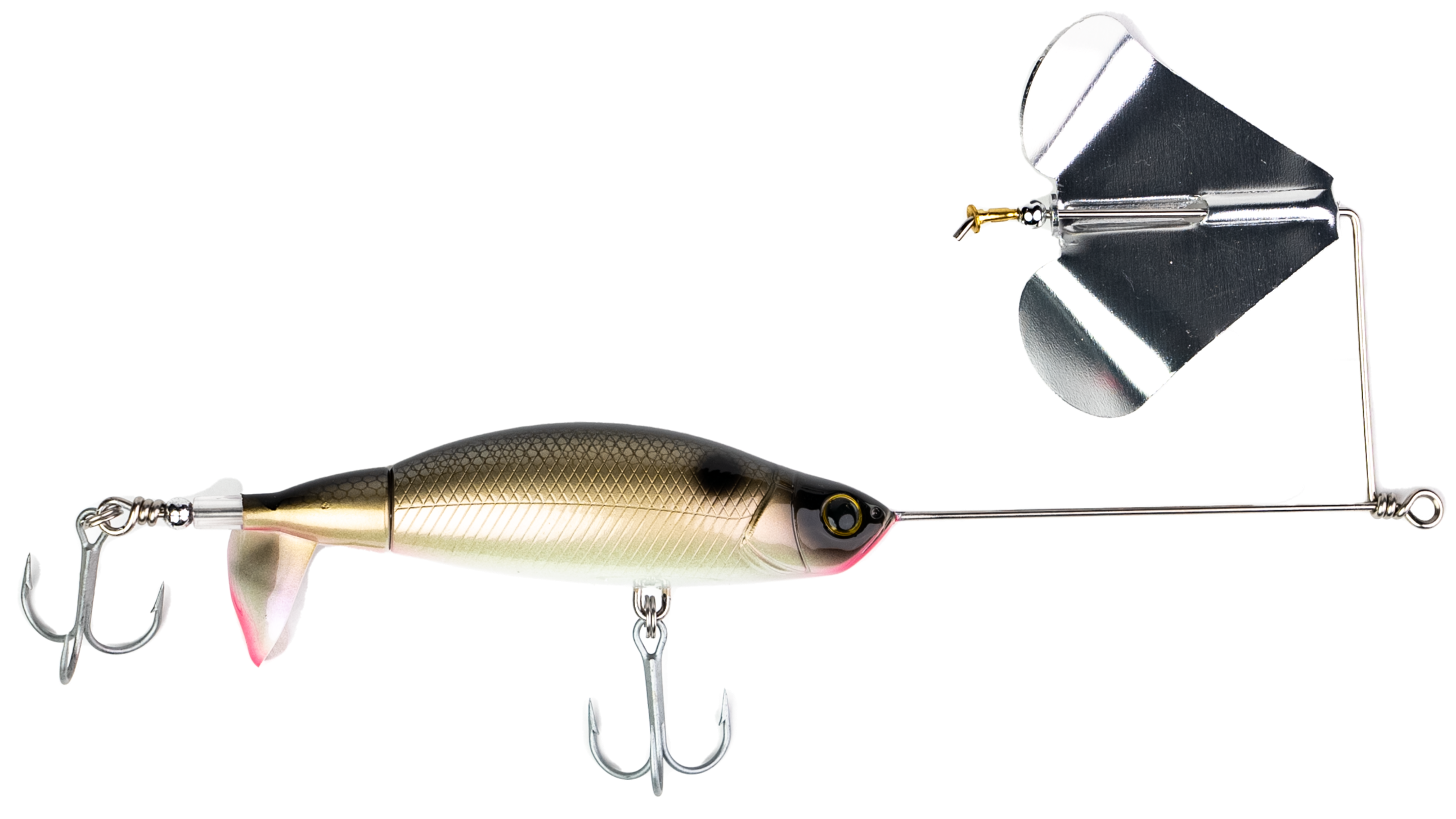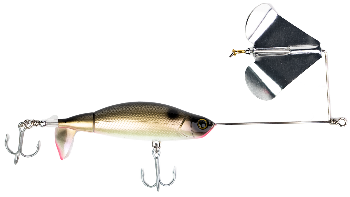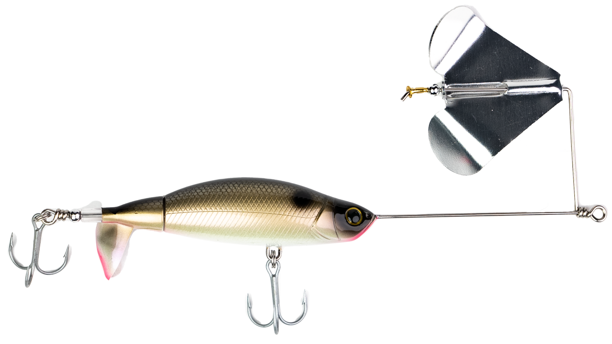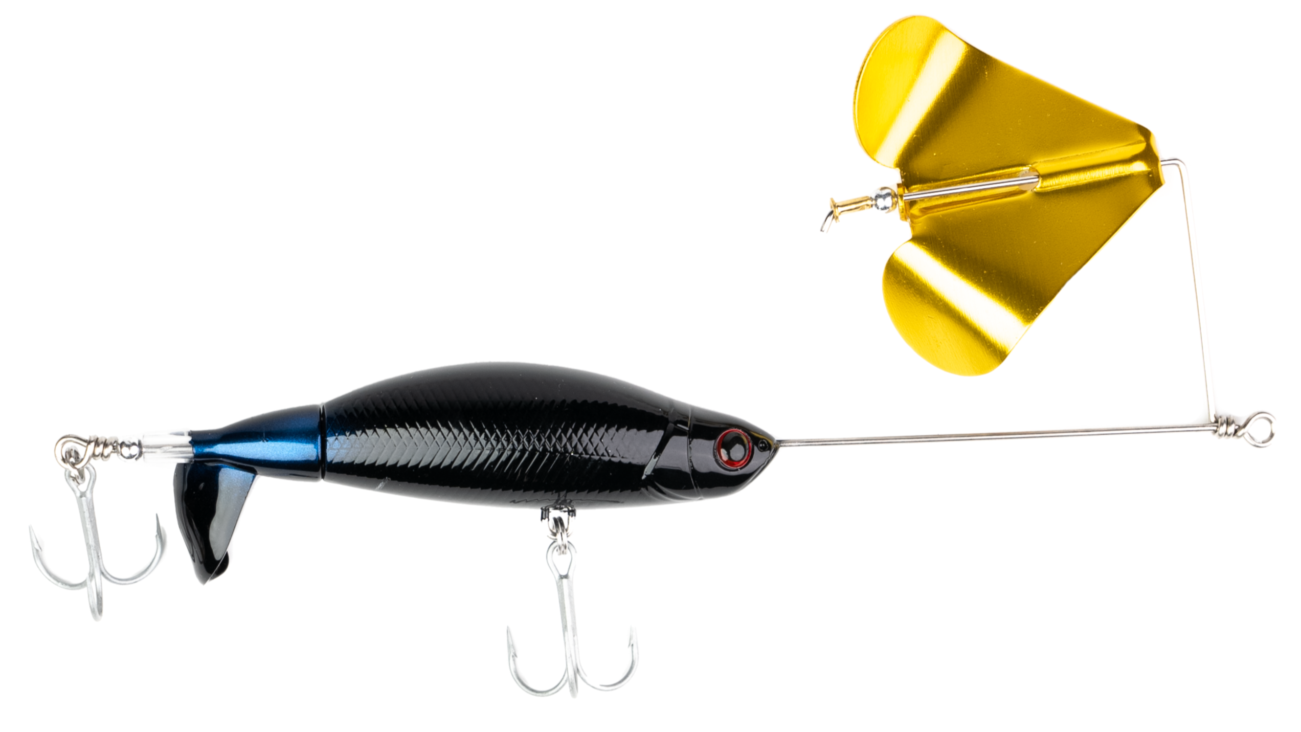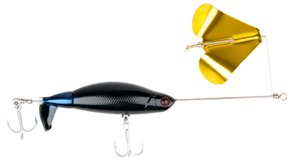 A unique through-wire top water bait. On a slow retrieve, it will sound like a traditional buzz bait. Increase your reel speed to engage the rear prop for a dual sound. Equipped with a 1 7/8 aluminum blade, twisted line tie, a hard body, and two 3X treble hooks.