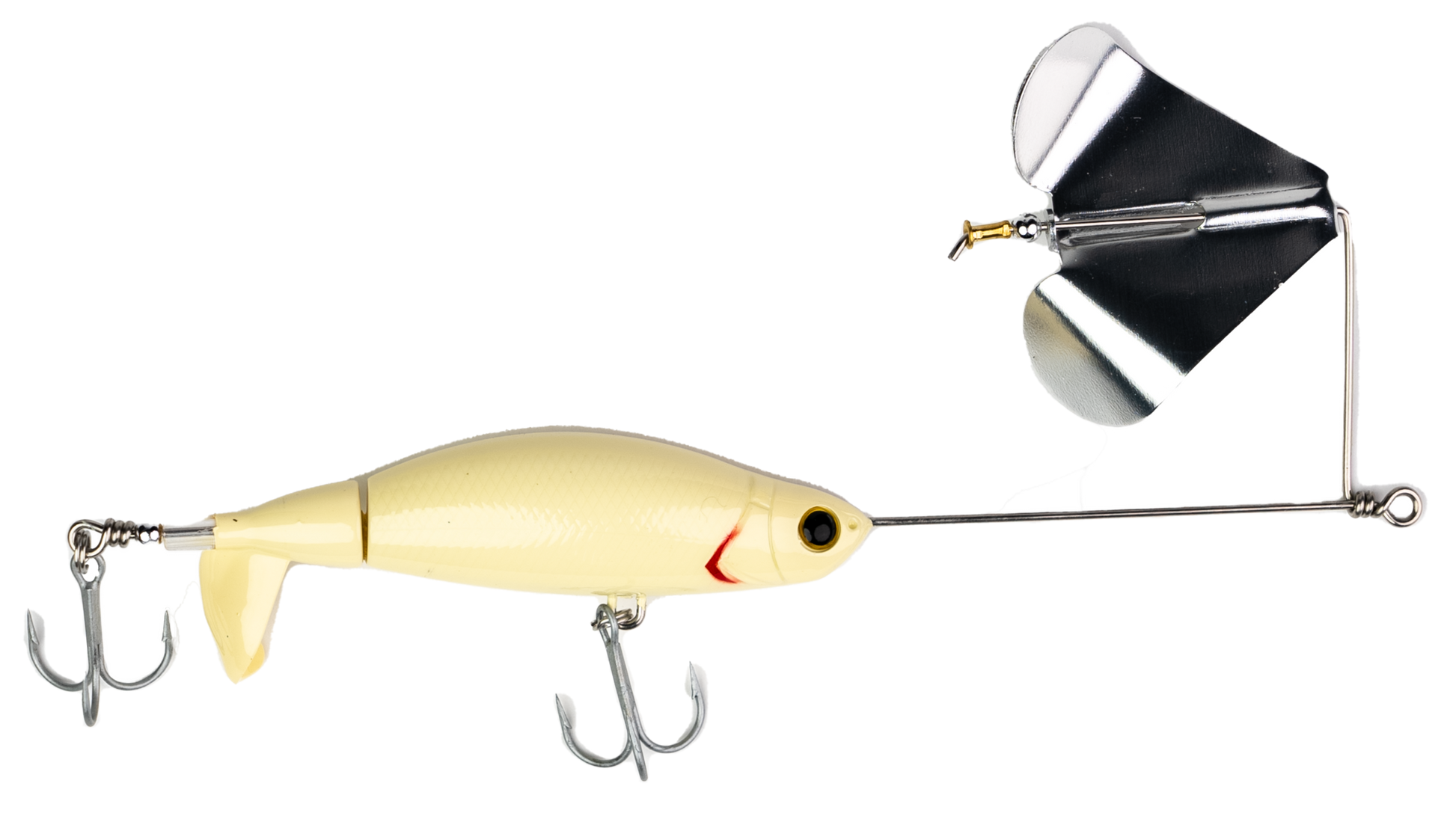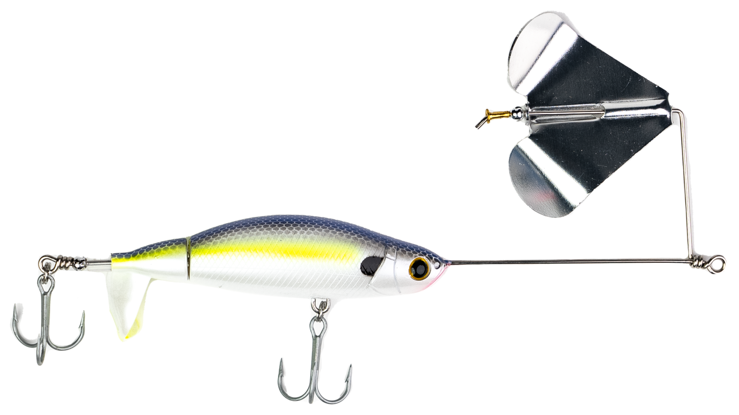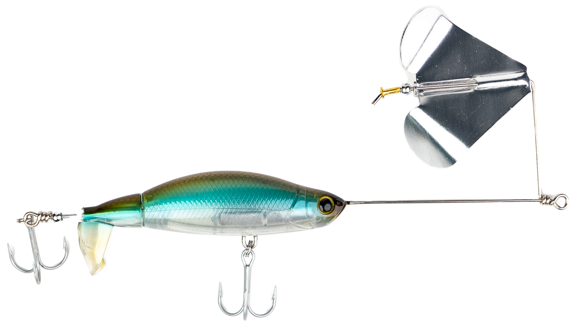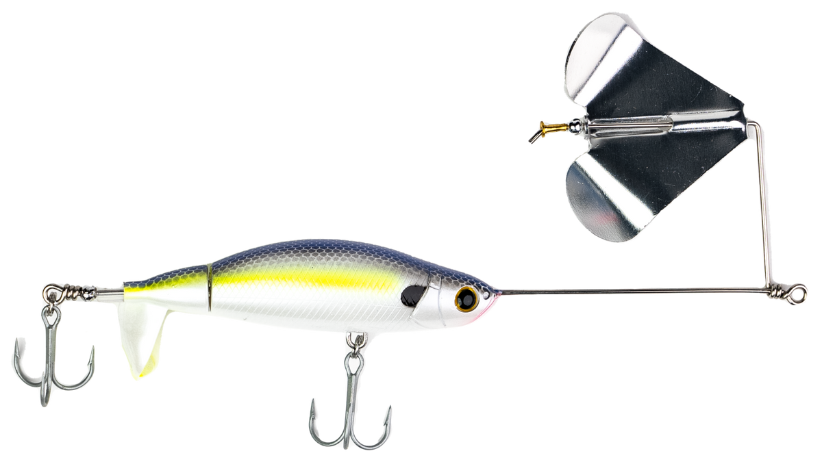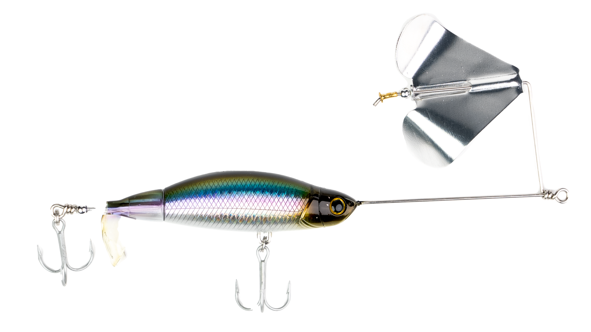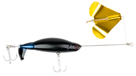 A unique through-wire top water bait. On a slow retrieve, it will sound like a traditional buzz bait. Increase your reel speed to engage the rear prop for a dual sound. Equipped with a 1 7/8 aluminum blade, twisted line tie, a hard body, and two 3X treble hooks.