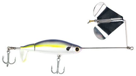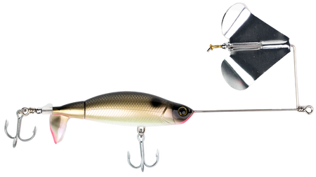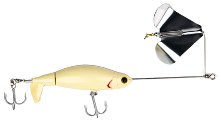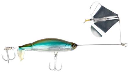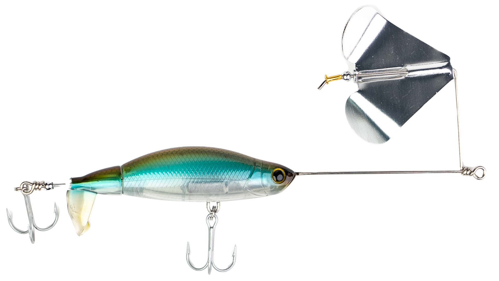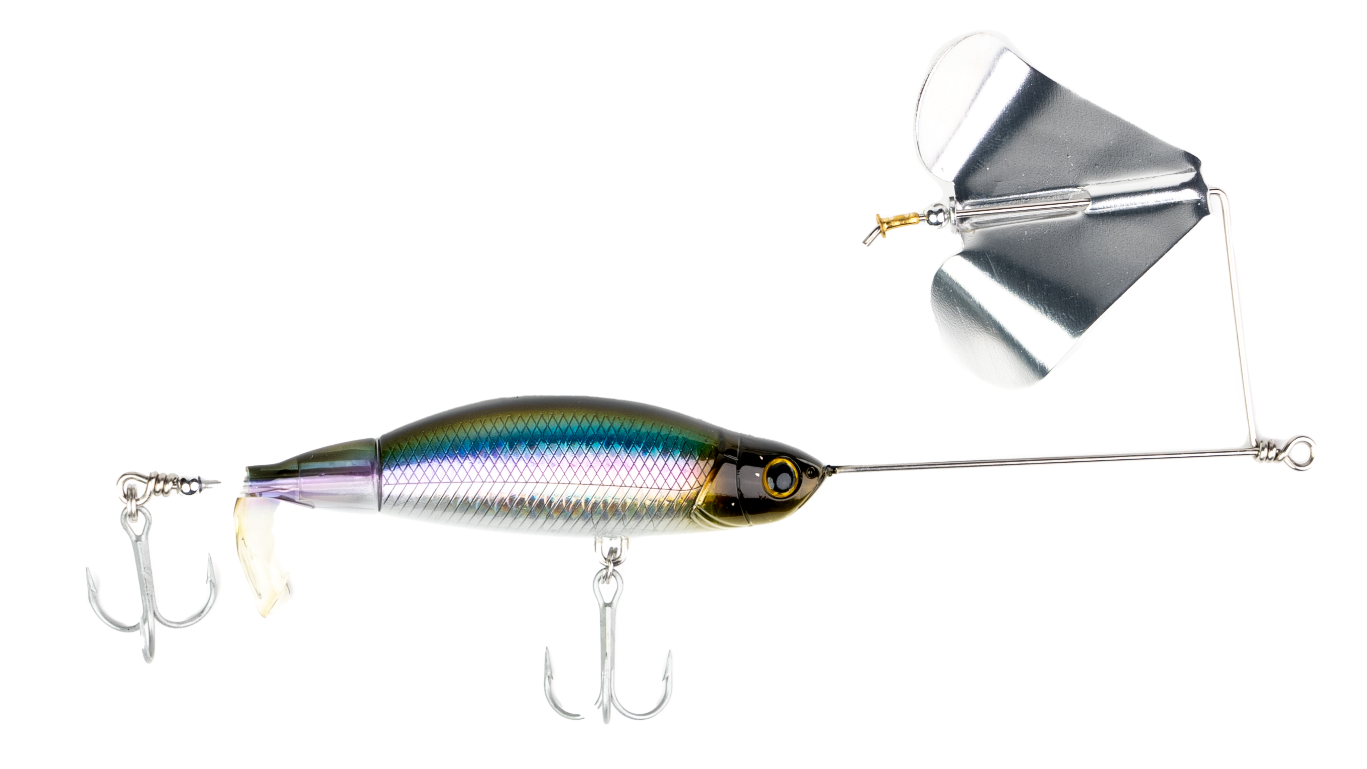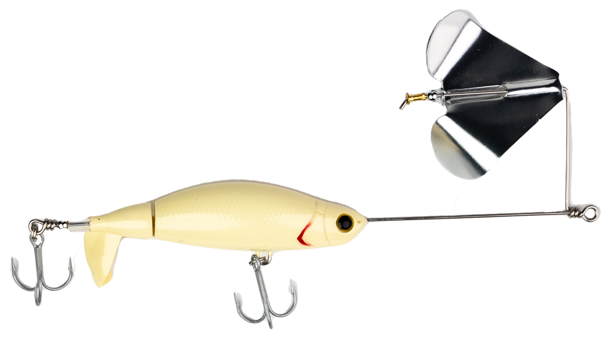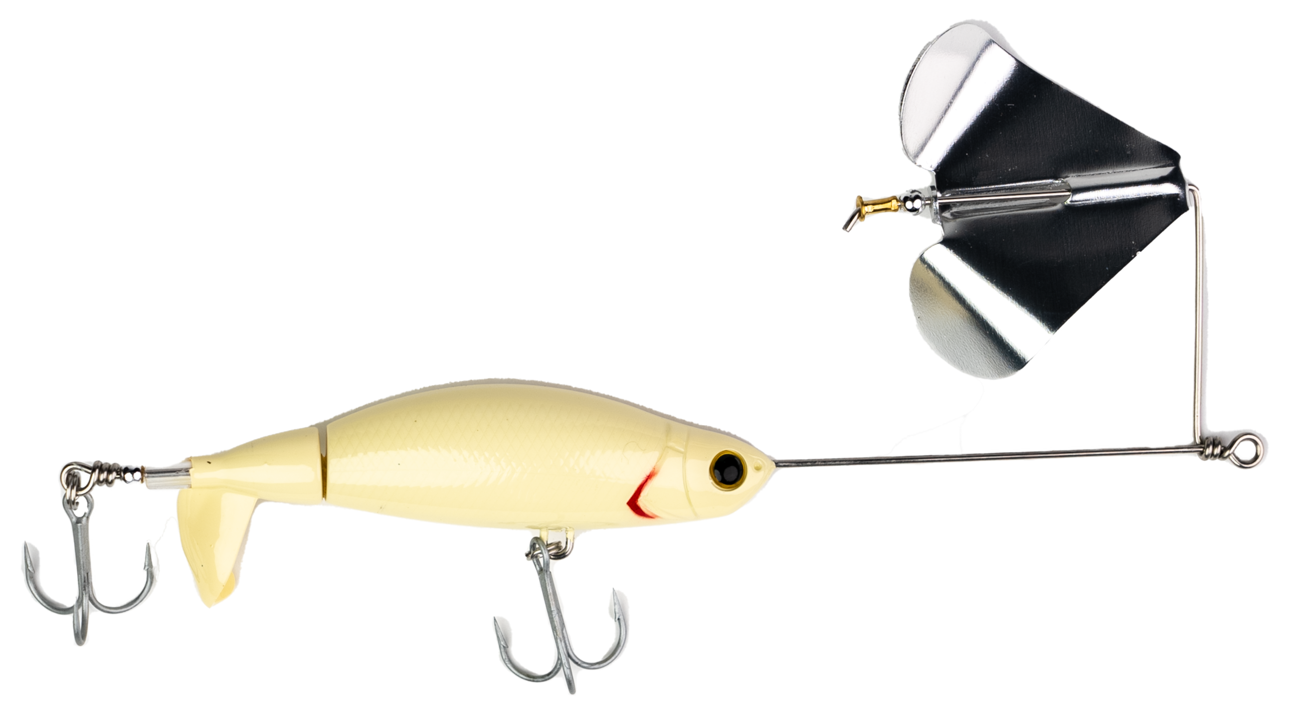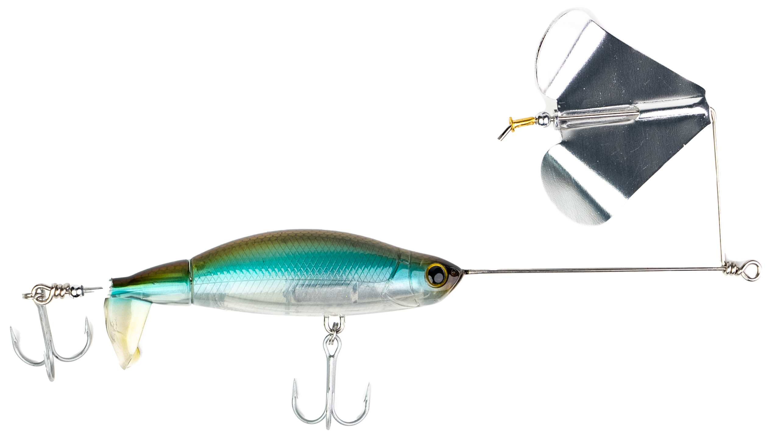 A unique through-wire top water bait. On a slow retrieve, it will sound like a traditional buzz bait. Increase your reel speed to engage the rear prop for a dual sound. Equipped with a 1 7/8 aluminum blade, twisted line tie, a hard body, and two 3X treble hooks.