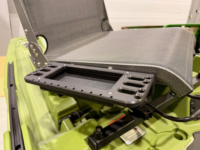 Our Seat Caddies are great for storing tools or baits right at your fingertips. We have two styles. One with a tray and tool holders. The other one has built in track with tool holders. So, it gives you the ability to setup your kayak up for however you might fish. They are easy to install and made in the USA.